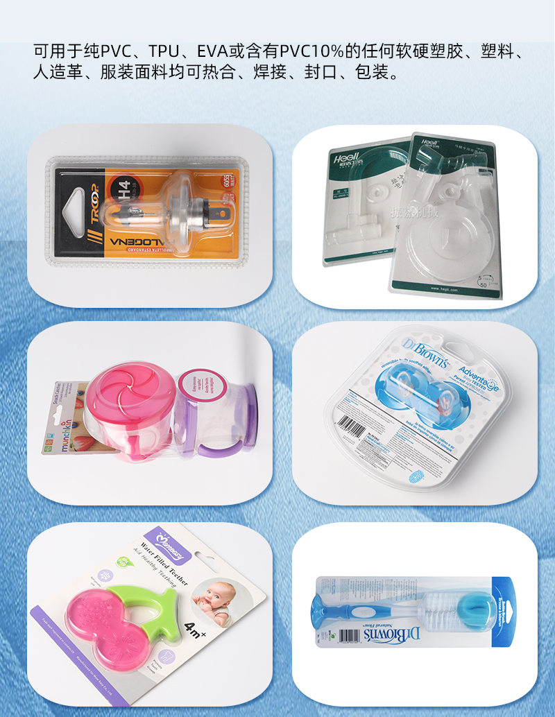 自動高周波機,壓母嬰產品包裝,目前國家發(fā)布公告,給3歲以下的寶寶發(fā)放補貼,這能促進對母嬰產品的消費,那么母嬰產品用什么包裝合適呢?振嘉對于母嬰產品包裝可是有很多經驗,有多家母嬰產品廠家與振嘉合作。那么由振嘉跟各位介紹這款機器,首先,全自動高周波機可用于純PVC、TPU、EVA或含有PVC10%的任何軟硬塑膠、塑料、人造革、服裝面料均可熱合、焊接、封口、包裝。因此,振嘉的高周波機是能滿足客戶的需求的,振嘉機械專業(yè)做高周波設備已 有22年,更多詳情歡迎聯(lián)系我司李先生13927715208